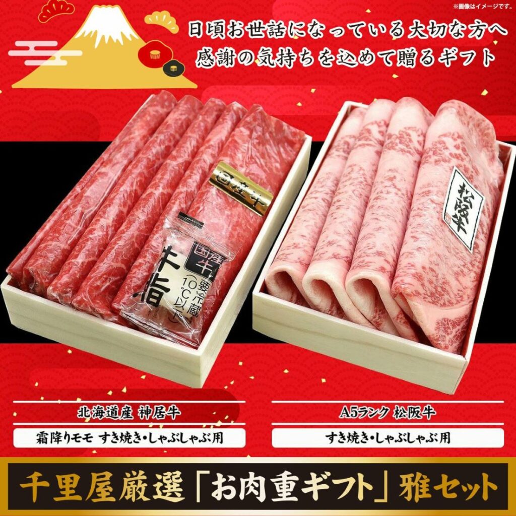 さて今回ご紹介する商品はこの時期の贈り物としてピッタリなセット商品となっており、極上のブランド牛「松阪牛」と高品質な国産「神居牛」がお重箱セットになり存分に美味しいお肉をお楽しみ頂けるかと思います。またこの時期だとお歳暮・お年賀の贈り物としても喜んで頂ける逸品ですので、ご覧下さいませ。