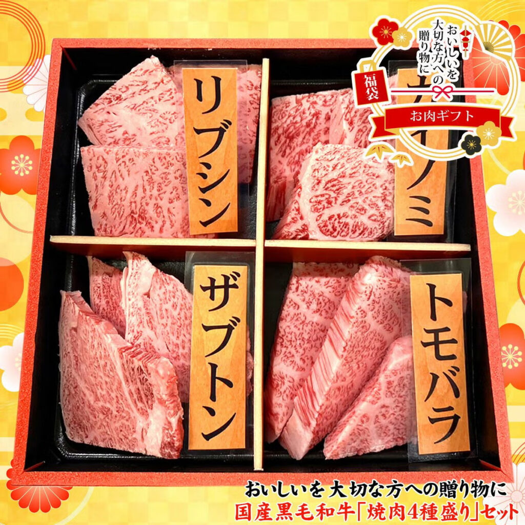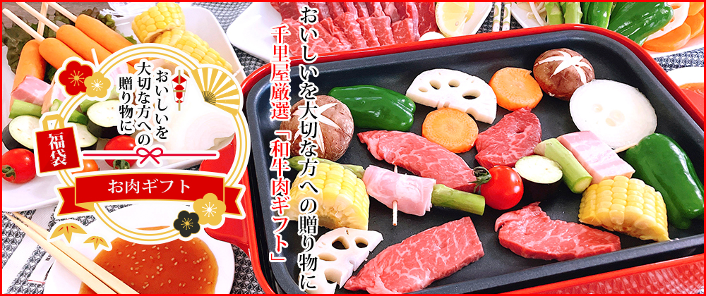 肉工房千里屋が厳選するお肉を牛(ギュッ)と詰め込んだ「焼肉4種盛りセット」が 誕生しました。国産黒毛和牛のリブシン・カイノミ・ザブトン・トモバラの希少部位が 各80gと思う存分お召上がり頂けるギフトはもちろんの事、内祝などの贈答としても喜んで頂けるセット商品となっております。