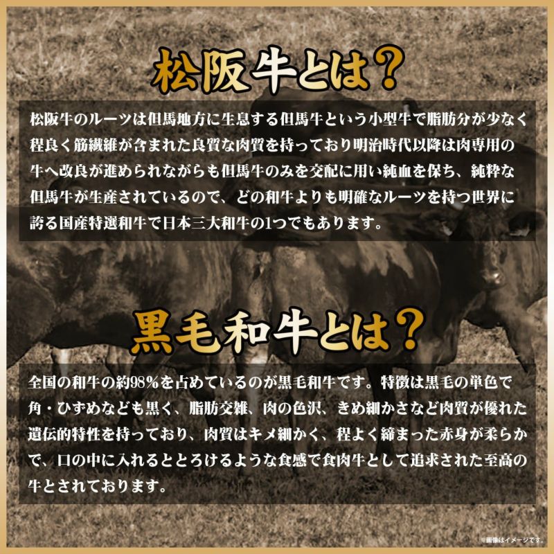 ギフトはもちろんの事、内祝いなどの贈答としても喜んで 頂ける商品となっており、松阪牛と黒毛和牛のお肉を食べ 比べもお楽しみ頂けるので、至福の極を感じてもらえる 商品となっております。