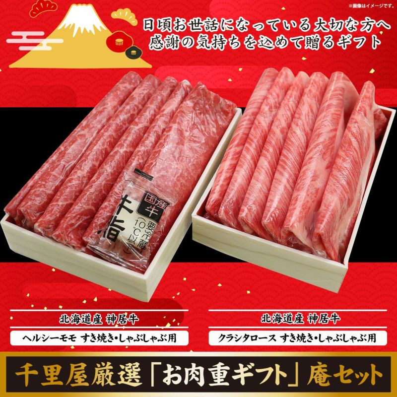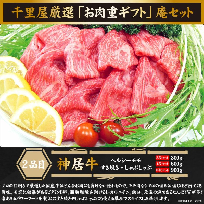 単一生産者によるブランド牛となっており高品質な国産牛「神居牛」の クラシタロースとモモ肉が各300g合計600gの2段セット、各600g合計 1.2kgの4段セット、各900g合計1.8kgの6段セットになりお肉重セット として登場! ギフトはもちろんの事、内祝などの贈答としても喜んで 頂ける商品となっております。