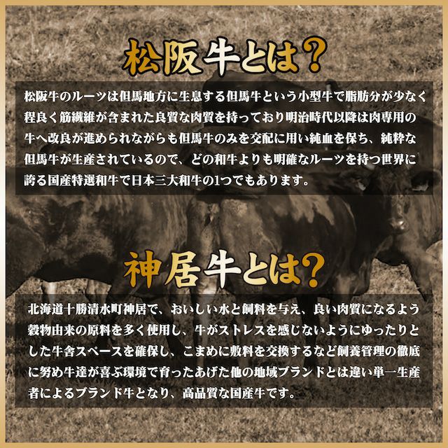 お肉のプロフェッショナルが厳選した極上の誰もが知るブランド牛「松阪牛」 単一生産者によるブランド牛となっており高品質な国産牛の「神居牛」が 各300gずつの合計600gがセットになりお肉重セットとして登場! ギフトは もちろんの事、内祝などの贈答としても喜んで頂ける商品となっております。