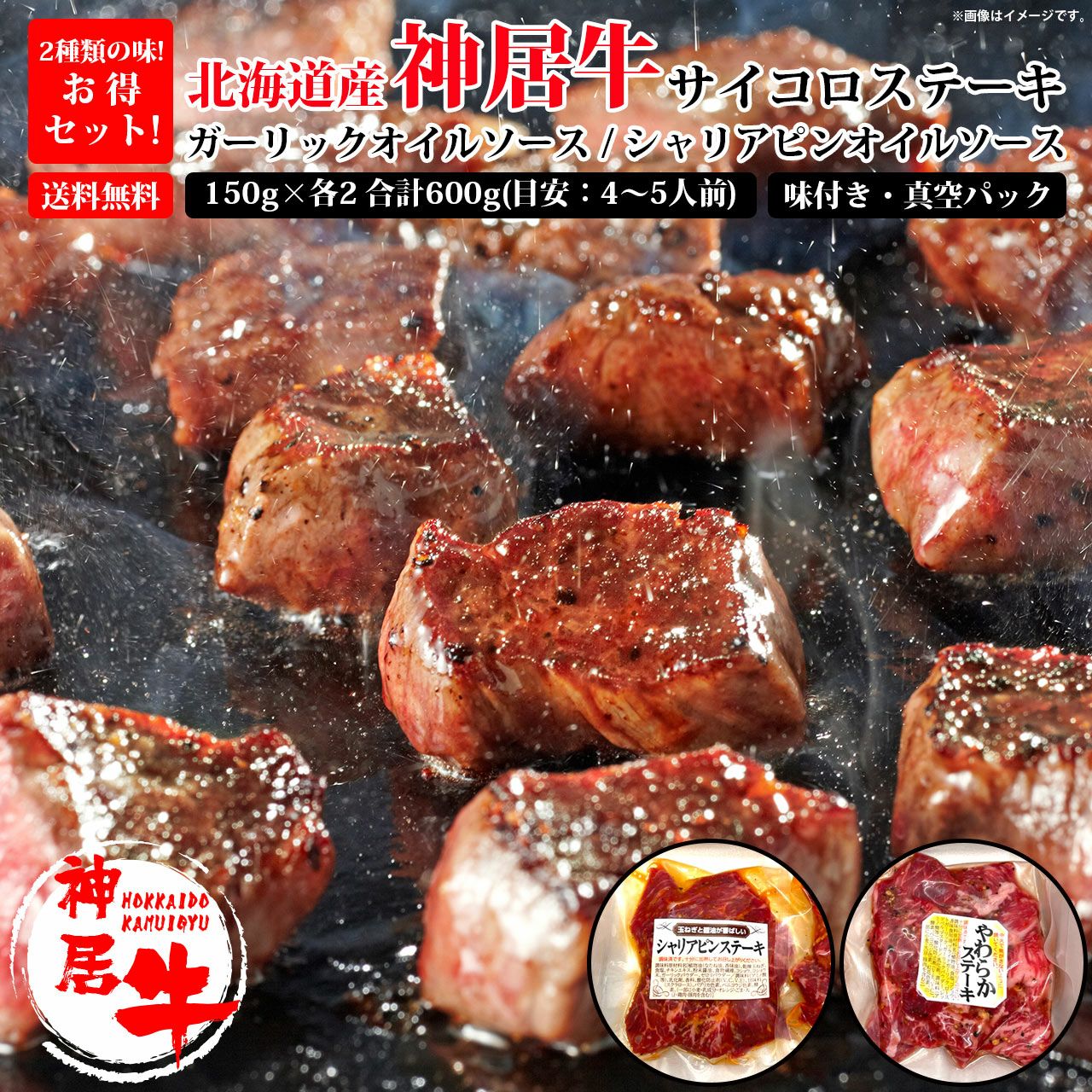 【150g×各2 合計600g】北海道産神居牛サイコロステーキセット ガーリック・シャリアピンオイルソース