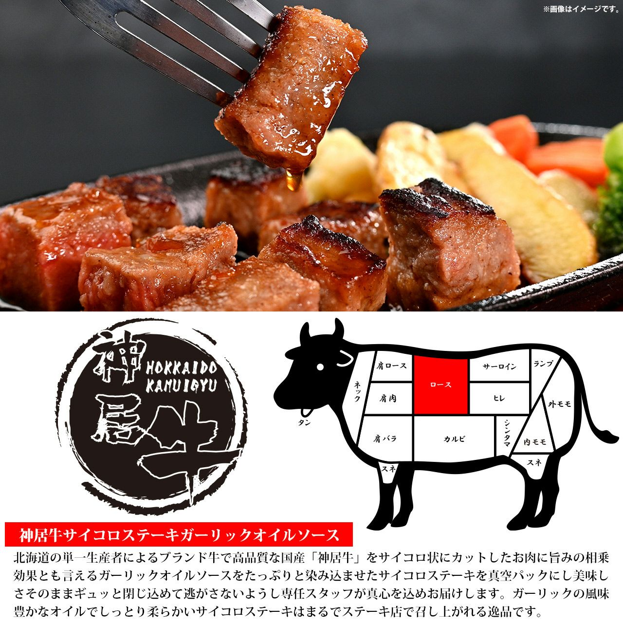 北海道の単一生産者によるブランド牛で高品質な 国産「神居牛」をサイコロ状にカットしたお肉を ガーリックオイルソースとシャリアピンオイルソ ース2種類に漬け込んだサイコロステーキを真空 パックにし美味しさそのままギュッと閉じ込めて 逃がさないよう専任スタッフが真心を込めお届け します。
