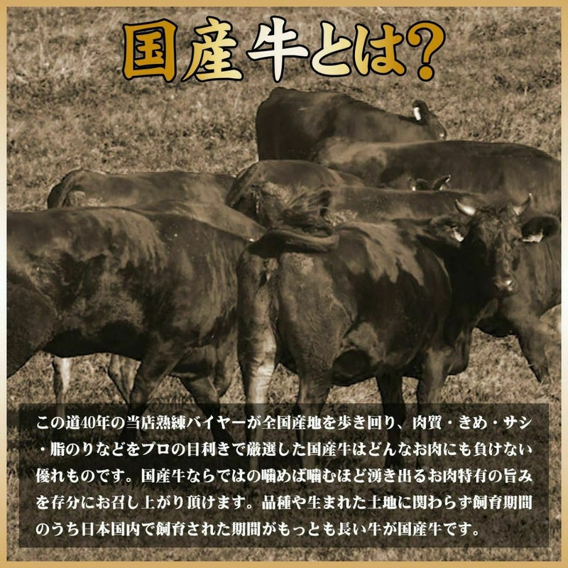 この道40年の当店熟練バイヤーが全国産地を歩き回り、肉質・きめ ・サシ・脂のりなどをプロの目利きで厳選した国産牛はどんなお肉 にも負けない優れものです。国産牛ならではの噛めば噛むほど湧き 出るお肉特有の旨みを存分にお召し上がり頂けます。品種や生まれ た土地に関わらず飼育期間のうち日本国内で飼育された期間がもっ とも長い牛が国産牛です。