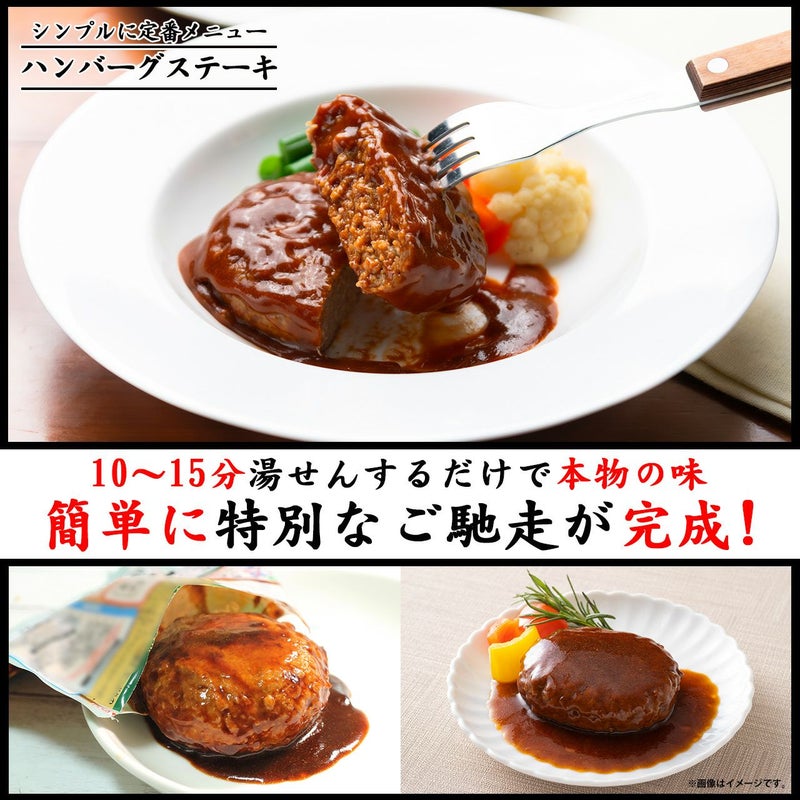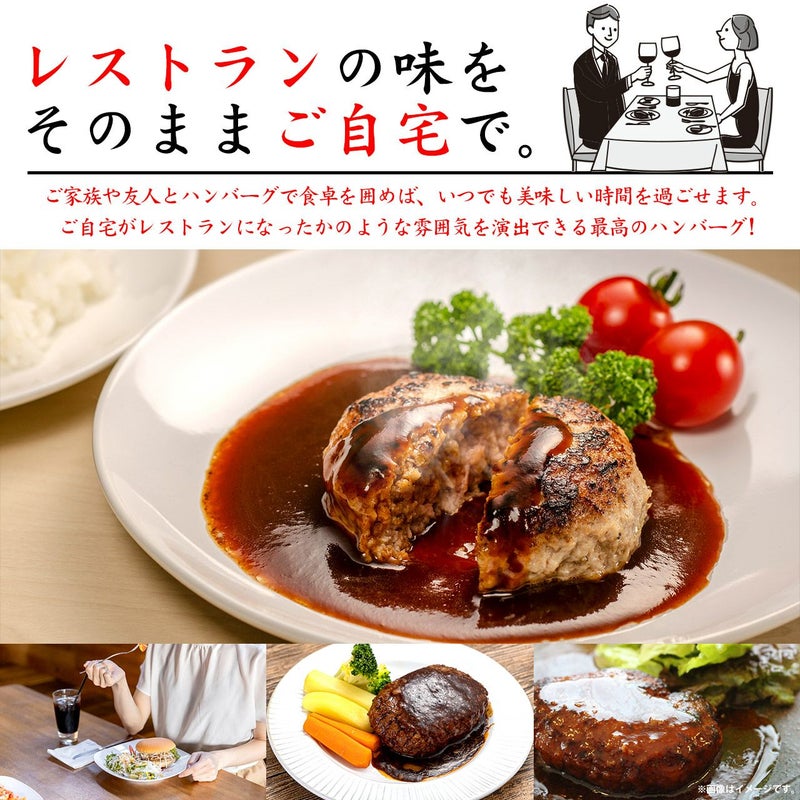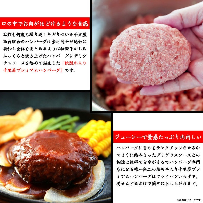 ジューシーで量感たっぷり肉肉しい! ハンバーグに旨さを ランクアップさせるかのように絡み合ったデミグラスソース との相性は抜群で食卓がまるでハンバーグ専門店になる唯一 無二の松阪牛入り千里屋プレミアムハンバーグはフライパン いらずで湯せんするだけで簡単に召し上がれます。