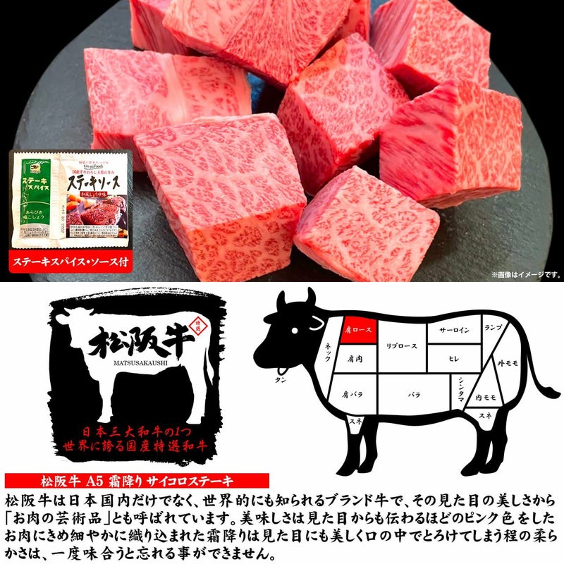 A5ランク松阪牛の肩ロースを1口でも食べれるようサイコロ状にカットし特別価格でのご提供となります。