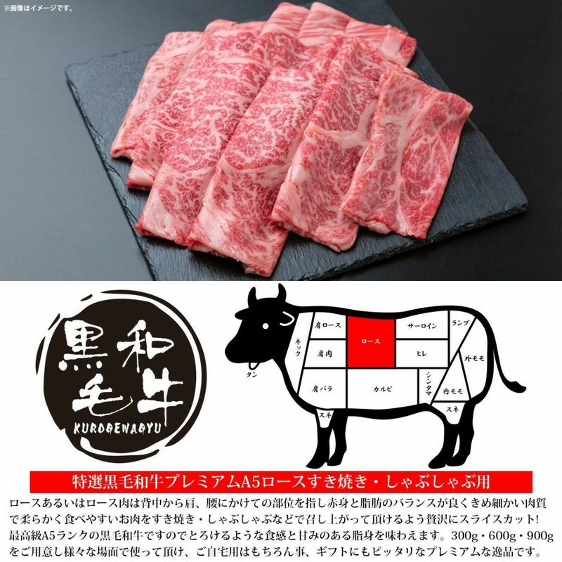 ロースあるいはロース肉は背中から肩、腰にかけての部位を 指し赤身と脂肪のバランスが良くきめ細かい肉質で柔らかく 食べやすいお肉をすき焼き・しゃぶしゃぶなどで召し上がっ て頂けるよう贅沢にスライスカットしました。さらに最高級 A5ランクの黒毛和牛ですのでとろけるような食感と甘みの ある脂身を味わえます。ご自宅用はもちろん事、ギフトにも ピッタリなプレミアムな逸品です。