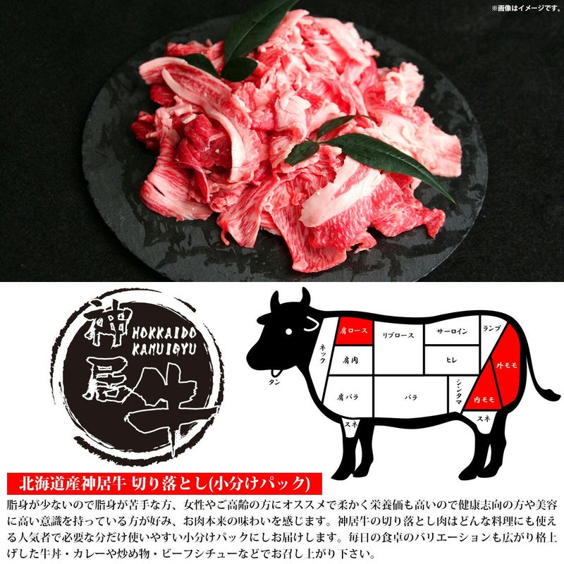 神居牛の切り落とし肉はどんな料理にも使える人気者で必要な分だけ使いやす い小分けパックにしお届けします。毎日の食卓のバリエーションも広がり格上 げした牛丼・カレーや炒め物・ビーフシチューなどでお召し上がり下さい。
