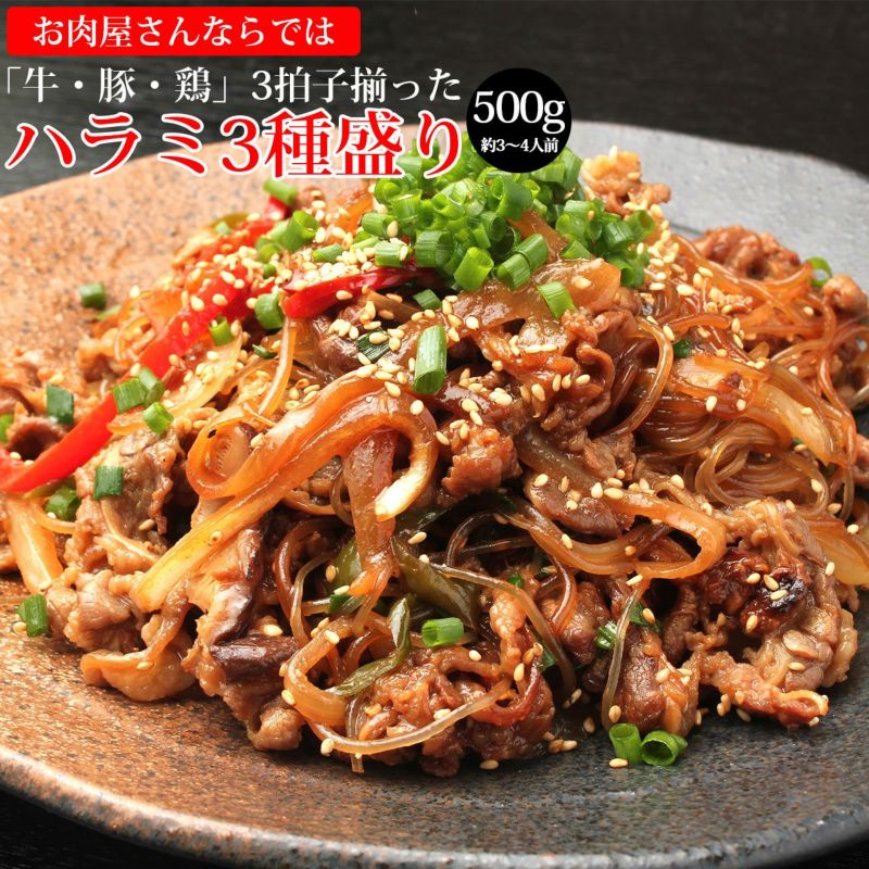 【500g】お肉屋さんならでは「牛・豚・鶏」3拍子揃ったハラミ3種盛り 3~4人前