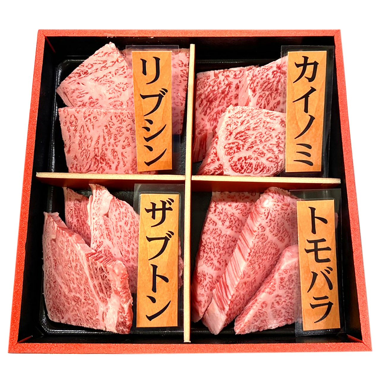肉工房千里屋が厳選するお肉を牛(ギュッ)と詰め込んだ「焼肉4種盛りセット」が 誕生しました。国産黒毛和牛のリブシン・カイノミ・ザブトン・トモバラの希少部位が 各80gと思う存分お召上がり頂けるギフトはもちろんの事、内祝などの贈答としても 喜んで頂けるセット商品となっております。