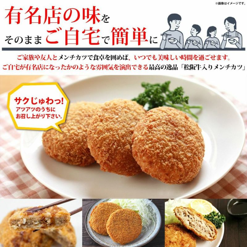 和牛の中の最高峰「松阪牛」特有の上質な旨み甘みを 閉じ込めたお肉 たっぷりでジューシーさがたまらない サクじゅわっ!メンチカツです。 油で揚げてあり調理済みなので揚げる手間が不要で電子レンジ(500W) で2~3分チンする だけ簡単!