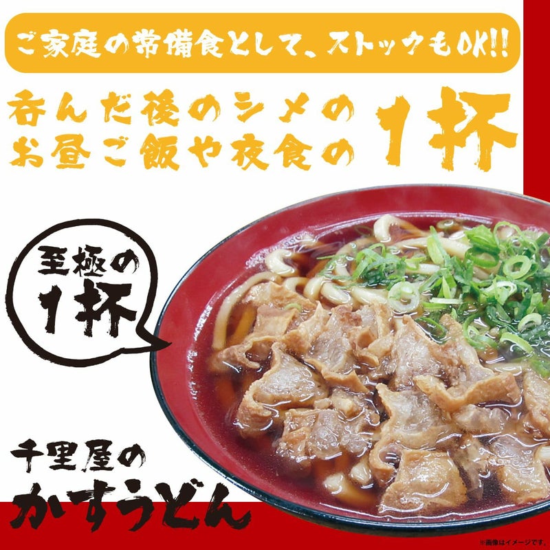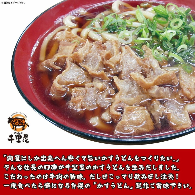「肉屋にしか出来へん安くて旨いかすうどんと肉そばを つくりたい。」そんな社長の口癖が千里屋のかすうどんと 肉そばを生みだしました。こだわったのは和牛(牛肉)の旨味。 だしはこってり飲みほし注意!